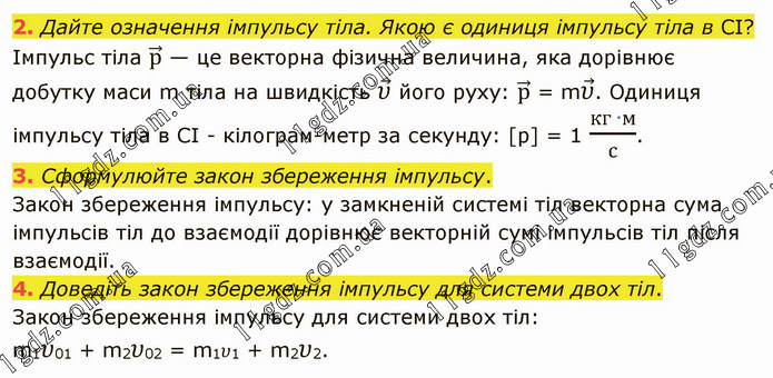Дайте означення імпульсу тіла. Якою є одиниця імпульсу тіла в СІ? Імпульс тіла р ⃗ — це векторна фізична величина, яка дорівнює добутку маси m тіла на швидкість υ ⃗ його руху: р ⃗ = mυ ⃗. Одиниця імпульсу тіла в СІ - кілограм-метр за секунду: [p] = 1 (кг ∙м)/с. 3. Сформулюйте закон збереження імпульсу. Закон збереження імпульсу: у замкненій системі тіл векторна сума імпульсів тіл до взаємодії дорівнює векторній сумі імпульсів тіл після взаємодії. 4. Доведіть закон збереження імпульсу для системи двох тіл. Закон збереження імпульсу для системи двох тіл: m1υ01 + m2υ02 = m1υ1 + m2υ2.