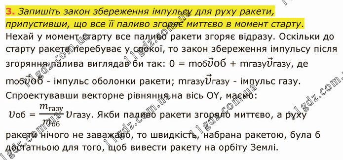 Запишіть закон збереження імпульсу для руху ракети, припустивши, що все її паливо згоряє миттєво в момент старту. Нехай у момент старту все паливо ракети згоряє відразу. Оскільки до старту ракета перебуває у спокої, то закон збереження імпульсу після згоряння палива виглядав би так: 0 = mобυ ⃗об + mгазуυ ⃗газу, де mобυ ⃗об - імпульс оболонки ракети; mгазуυ ⃗газу - імпульс газу. Спроектувавши векторне рівняння на вісь ОY, маємо: υоб = m_газу/m_об υгазу. Якби паливо ракети згоряло миттєво, а руху ракети нічого не заважало, то швидкість, набрана ракетою, була б достатньою для того, щоб вивести ракету на орбіту Землі.
