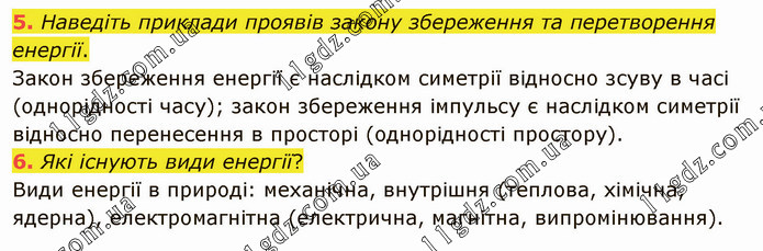 Наведіть приклади проявів закону збереження та перетворення енергії. Закон збереження енергії є наслідком симетрії відносно зсуву в часі (однорідності часу); закон збереження імпульсу є наслідком симетрії відносно перенесення в просторі (однорідності простору). 6. Які існують види енергії? Види енергії в природі: механічна, внутрішня (теплова, хімічна, ядерна), електромагнітна (електрична, магнітна, випромінювання).