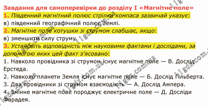 Південний магнітний полюс стрілки компаса зазвичай указує: в) південний географічний полюс Землі. 2. Магнітне поле котушки зі струмом слабшає, якщо: в) зменшити силу струму. 3. Установіть відповідність між науковими фактами і дослідами, за допомогою яких цей факт з’ясовано: 1. Навколо провідника зі струмом існує магнітне поле — В. Дослід Ерстеда. 2. Навколо планети Земля існує магнітне поле — Б. Дослід Ґільберта. 3. Два провідники зі струмом взаємодіють — А. Дослід Ампера. 4. Змінне магнітне поле породжує електричне поле — Д. Досліди Фарадея.