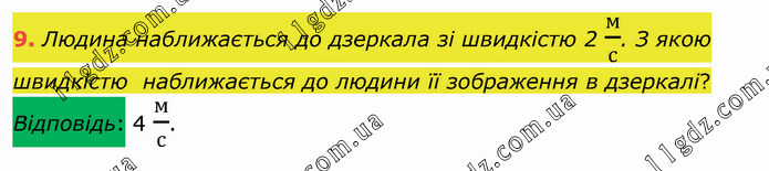 Людина наближається до дзеркала зі швидкістю 2 м/с. З якою швидкістю наближається до людини її зображення в дзеркалі? Відповідь: 4 м/с.