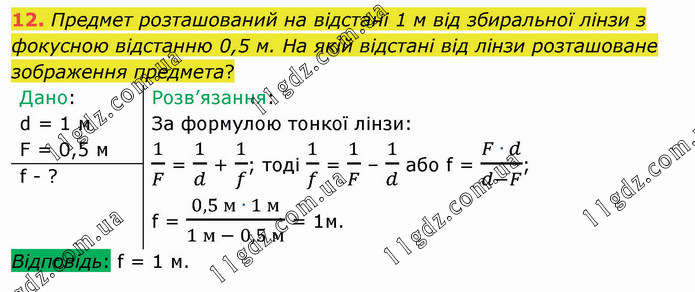Предмет розташований на відстані 1 м від збиральної лінзи з фокусною відстанню 0,5 м. На якій відстані від лінзи розташоване зображення предмета?