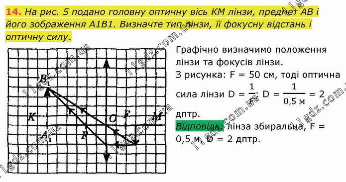 На рис. 5 подано головну оптичну вісь КМ лінзи, предмет АВ і його зображення А1В1. Визначте тип лінзи, її фокусну відстань і оптичну силу.
