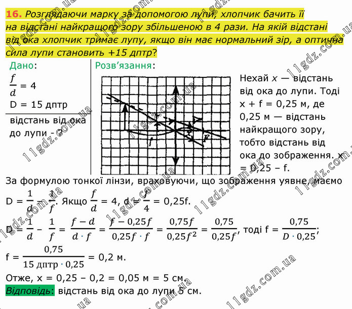 Розглядаючи марку за допомогою лупи, хлопчик бачить її на відстані найкращого зору збільшеною в 4 рази. На якій відстані від ока хлопчик тримає лупу, якщо він має нормальний зір, а оптична сила лупи становить +15 дптр?