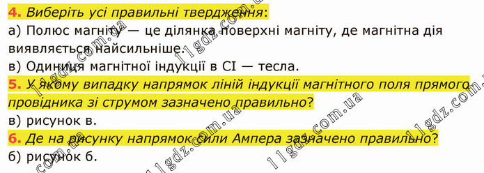 Виберіть усі правильні твердження: а) Полюс магніту — це ділянка поверхні магніту, де магнітна дія виявляється найсильніше. в) Одиниця магнітної індукції в СІ — тесла. 5. У якому випадку напрямок ліній індукції магнітного поля прямого провідника зі струмом зазначено правильно? в) рисунок в. 6. Де на рисунку напрямок сили Ампера зазначено правильно? б) рисунок б.