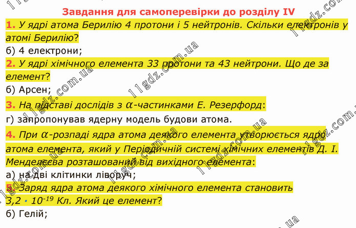 У ядрі атома Берилію 4 протони і 5 нейтронів. Скільки електронів у атомі Берилію? б) 4 електрони; 2. У ядрі хімічного елемента 33 протони та 43 нейтрони. Що де за елемент? б) Арсен; 3. На підставі дослідів з α-частинками Е. Резерфорд: г) запропонував ядерну модель будови атома. 4. При α-розпаді ядра атома деякого елемента утворюється ядро атома елемента, який у Періодичній системі хімічних елементів Д. І. Менделєєва розташований від вихідного елемента: а) на дві клітинки ліворуч; 5. Заряд ядра атома деякого хімічного елемента становить 3,2 ∙ 10-19 Кл. Який це елемент? б) Гелій;