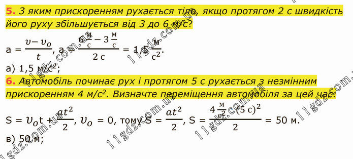 3 яким прискоренням рухається тіло, якщо протягом 2 с швидкість його руху збільшується від 3 до 6 м/с? a = (υ- υ_o)/t, a = (6 м/с - 3 м/с )/(2 с) = 1,5 м/с^2 . а) 1,5 м/с2; 6. Автомобіль починає рух і протягом 5 с рухається з незмінним прискоренням 4 м/с2. Визначте переміщення автомобіля за цей час.