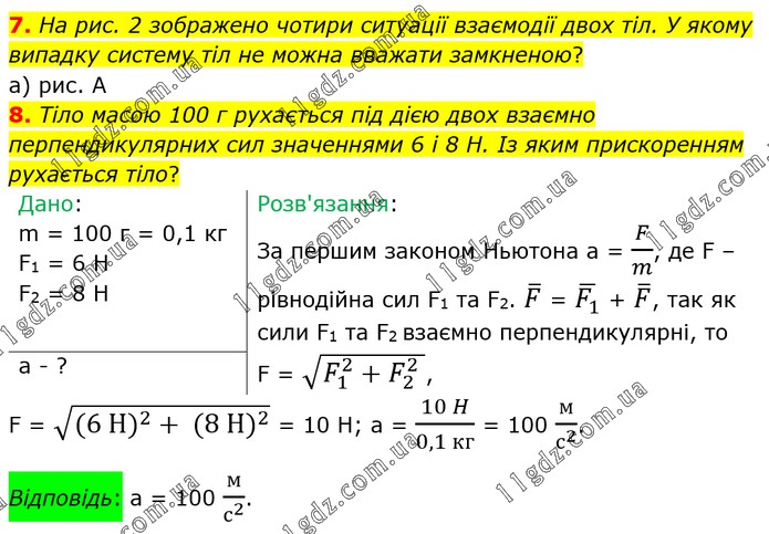 7. На рис. 2 зображено чотири ситуації взаємодії двох тіл. У якому випадку систему тіл не можна вважати замкненою? а) рис. А 8. Тіло масою 100 г рухається під дією двох взаємно перпендикулярних сил значеннями 6 і 8 Н. Із яким прискоренням рухається тіло? Дано: m = 100 г = 0,1 кг F1 = 6 H F2 = 8 H a - ? Розв'язання: За першим законом Ньютона a = F/m, де F – рівнодійна сил F1 та F2. F ̅ = (F_1 ) ̅ + F ̅, так як сили F1 та F2 взаємно перпендикулярні, то F = √(F_1^2+F_2^2 ), F = √((6 H)^2+ (8 H)^2 ) = 10 H; a = (10 H)/(0,1 кг) = 100 м/с^2 . Відповідь: а = 100 м/с^2 .