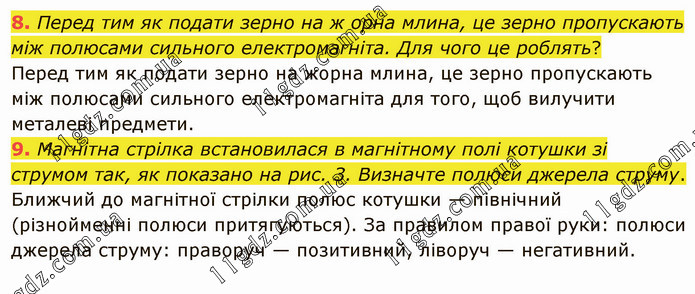 Перед тим як подати зерно на ж орна млина, це зерно пропускають між полюсами сильного електромагніта. Для чого це роблять? Перед тим як подати зерно на жорна млина, це зерно пропускають між полюсами сильного електромагніта для того, щоб вилучити металеві предмети. 9. Магнітна стрілка встановилася в магнітному полі котушки зі струмом так, як показано на рис. 3. Визначте полюси джерела струму. Ближчий до магнітної стрілки полюс котушки — північний (різнойменні полюси притягуються). За правилом правої руки: полюси джерела струму: праворуч — позитивний, ліворуч — негативний.
