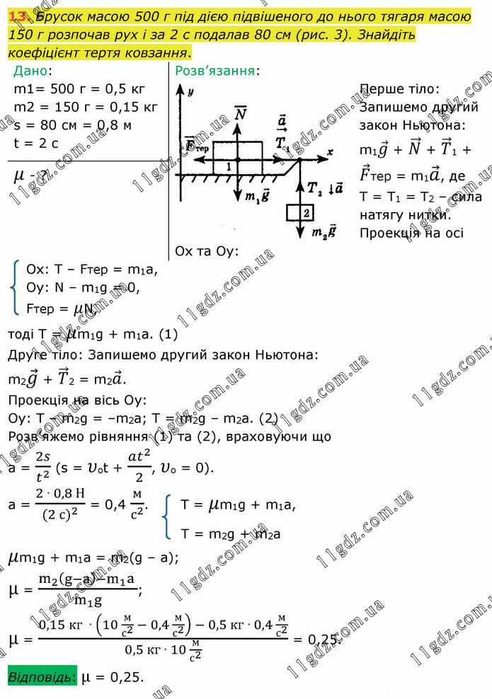 Брусок масою 500 г під дією підвішеного до нього тягаря масою 150 г розпочав рух і за 2 с подалав 80 см (рис. 3). Знайдіть коефіцієнт тертя ковзання.