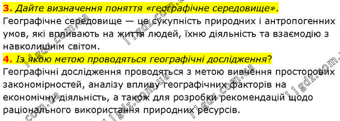 3. Дайте визначення поняття «географічне середовище». Географічне середовище — це сукупність природних і антропогенних умов, які впливають на життя людей, їхню діяльність та взаємодію з навколишнім світом. 4. Із якою метою проводяться географічні дослідження? Географічні дослідження проводяться з метою вивчення просторових закономірностей, аналізу впливу географічних факторів на економічну діяльність, а також для розробки рекомендацій щодо раціонального використання природних ресурсів.