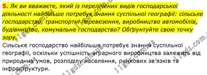 Як ви вважаєте, який із перелічених видів господарської діяльності найбільше потребує знання суспільної географії: сільське господарство, транспортні перевезення, виробництво автомобілів, будівництво, комунальне господарство? Обґрунтуйте свою точку зору. Сільське господарство найбільше потребує знання суспільної географії, оскільки успішність аграрного виробництва залежить від природних умов, розподілу населення, ринкових зв’язків та інфраструктури.