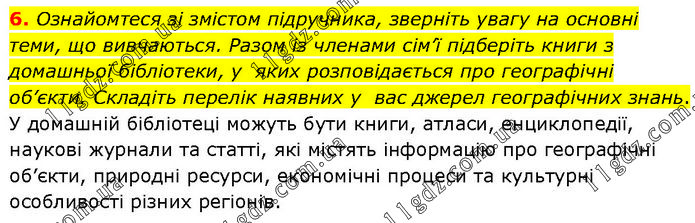 Ознайомтеся зі змістом підручника, зверніть увагу на основні теми, що вивчаються. Разом із членами сім’ї підберіть книги з домашньої бібліотеки, у яких розповідається про географічні об’єкти. Складіть перелік наявних у вас джерел географічних знань. У домашній бібліотеці можуть бути книги, атласи, енциклопедії, наукові журнали та статті, які містять інформацію про географічні об’єкти, природні ресурси, економічні процеси та культурні особливості різних регіонів.