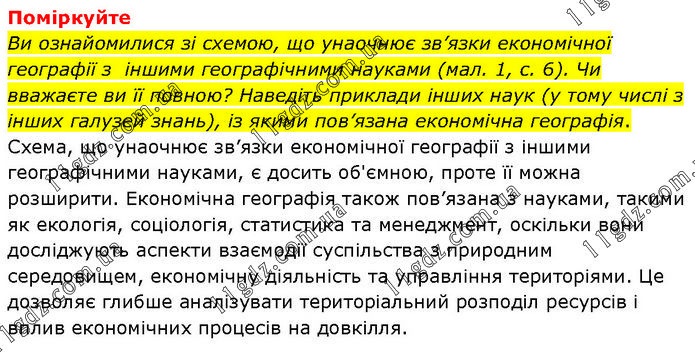 Поміркуйте Ви ознайомилися зі схемою, що унаочнює зв’язки економічної географії з іншими географічними науками (мал. 1, с. 6). Чи вважаєте ви її повною? Наведіть приклади інших наук (у тому числі з інших галузей знань), із якими пов’язана економічна географія. Схема, що унаочнює зв’язки економічної географії з іншими географічними науками, є досить об'ємною, проте її можна розширити. Економічна географія також пов’язана з науками, такими як екологія, соціологія, статистика та менеджмент, оскільки вони досліджують аспекти взаємодії суспільства з природним середовищем, економічну діяльність та управління територіями. Це дозволяє глибше аналізувати територіальний розподіл ресурсів і вплив економічних процесів на довкілля.