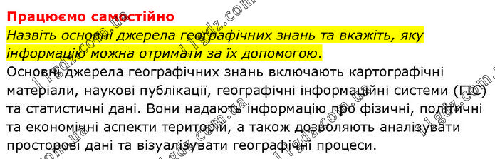 Працюємо самостійно Назвіть основні джерела географічних знань та вкажіть, яку інформацію можна отримати за їх допомогою. Основні джерела географічних знань включають картографічні матеріали, наукові публікації, географічні інформаційні системи (ГІС) та статистичні дані. Вони надають інформацію про фізичні, політичні та економічні аспекти територій, а також дозволяють аналізувати просторові дані та візуалізувати географічні процеси.
