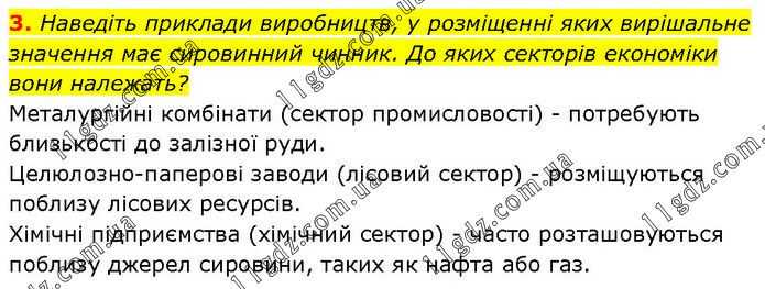 Наведіть приклади виробництв, у розміщенні яких вирішальне значення має сировинний чинник. До яких секторів економіки вони належать? Металургійні комбінати (сектор промисловості) - потребують близькості до залізної руди. Целюлозно-паперові заводи (лісовий сектор) - розміщуються поблизу лісових ресурсів. Хімічні підприємства (хімічний сектор) - часто розташовуються поблизу джерел сировини, таких як нафта або газ.