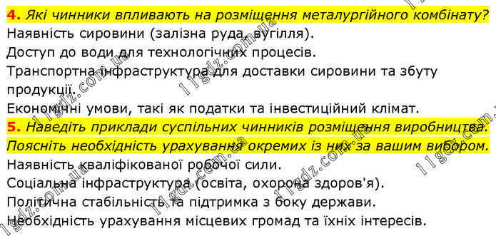 4. Які чинники впливають на розміщення металургійного комбінату? Наявність сировини (залізна руда, вугілля). Доступ до води для технологічних процесів. Транспортна інфраструктура для доставки сировини та збуту продукції. Економічні умови, такі як податки та інвестиційний клімат. 5. Наведіть приклади суспільних чинників розміщення виробництва. Поясніть необхідність урахування окремих із них за вашим вибором. Наявність кваліфікованої робочої сили. Соціальна інфраструктура (освіта, охорона здоров'я). Політична стабільність та підтримка з боку держави. Необхідність урахування місцевих громад та їхніх інтересів.