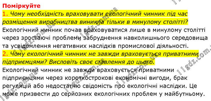 Поміркуйте 1. Чому необхідність враховувати екологічний чинник під час розміщення виробництва виникла тільки в минулому столітті? Екологічний чинник почав враховуватися лише в минулому столітті через зростаючі проблеми забруднення навколишнього середовища та усвідомлення негативних наслідків промислової діяльності. 2. Чому екологічний чинник не завжди враховується приватними підприємцями? Висловіть своє ставлення до цього. Екологічний чинник не завжди враховується приватними підприємцями через короткострокові економічні вигоди, брак регуляцій або недостатню свідомість про екологічні наслідки. Це може призвести до серйозних екологічних проблем у майбутньому.