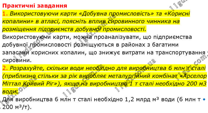 Практичні завдання 1. Використовуючи карти «Добувна промисловість» та «Корисні копалини» в атласі, поясніть вплив сировинного чинника на розміщення підприємств добувної промисловості. Використовуючи карти, можна проаналізувати, що підприємства добувної промисловості розміщуються в районах з багатими запасами корисних копалин, що знижує витрати на транспортування сировини. 2. Розрахуйте, скільки води необхідно для виробництва 6 млн т сталі (приблизно стільки за рік виробляє металургійний комбінат «Арселор Мiттал Кривий Рiг»), якщо на виробництво 1 т сталі необхідно 200 м3 води. Для виробництва 6 млн т сталі необхідно 1,2 млрд м³ води (6 млн т • 200 м³/т).