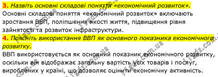 3. Назвіть основні складові поняття «економічний розвиток». Основні складові поняття «економічний розвиток» включають зростання ВВП, поліпшення якості життя, підвищення рівня зайнятості та розвиток інфраструктури. 4. Поясніть використання ВВП як основного показника економічного розвитку. ВВП використовується як основний показник економічного розвитку, оскільки він відображає загальну вартість усіх товарів і послуг, вироблених у країні, що дозволяє оцінити економічну активність.
