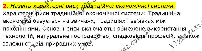 Назвіть характерні риси традиційної економічної системи. Характерні риси традиційної економічної системи: Традиційна економіка базується на звичаях, традиціях і зв'язках між поколіннями. Основні риси включають: обмежене використання технологій, натуральне господарство, спадковість професій, а також залежність від природних умов.