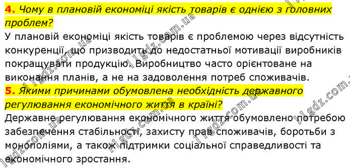 4. Чому в плановій економіці якість товарів є однією з головних проблем? У плановій економіці якість товарів є проблемою через відсутність конкуренції, що призводить до недостатньої мотивації виробників покращувати продукцію. Виробництво часто орієнтоване на виконання планів, а не на задоволення потреб споживачів. 5. Якими причинами обумовлена необхідність державного регулювання економічного життя в країні? Державне регулювання економічного життя обумовлено потребою забезпечення стабільності, захисту прав споживачів, боротьби з монополіями, а також підтримки соціальної справедливості та економічного зростання.
