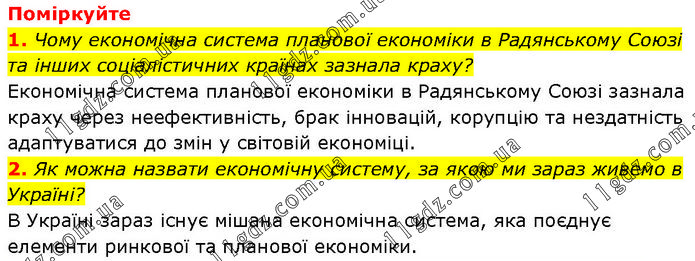 Поміркуйте 1. Чому економічна система планової економіки в Радянському Союзі та інших соціалістичних країнах зазнала краху? Економічна система планової економіки в Радянському Союзі зазнала краху через неефективність, брак інновацій, корупцію та нездатність адаптуватися до змін у світовій економіці. 2. Як можна назвати економічну систему, за якою ми зараз живемо в Україні? В Україні зараз існує мішана економічна система, яка поєднує елементи ринкової та планової економіки.
