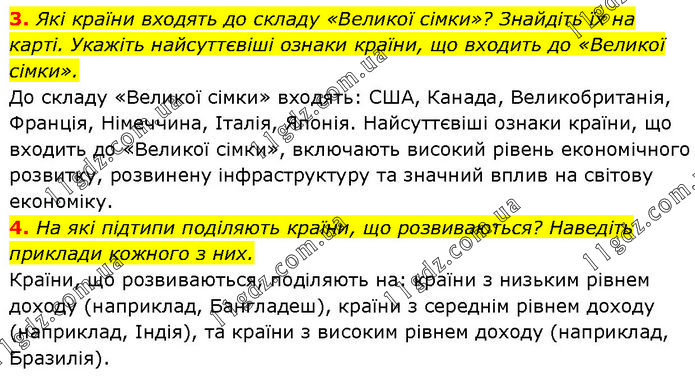 3. Які країни входять до складу «Великої сімки»? Знайдіть їх на карті. Укажіть найсуттєвіші ознаки країни, що входить до «Великої сімки». До складу «Великої сімки» входять: США, Канада, Великобританія, Франція, Німеччина, Італія, Японія. Найсуттєвіші ознаки країни, що входить до «Великої сімки», включають високий рівень економічного розвитку, розвинену інфраструктуру та значний вплив на світову економіку. 4. На які підтипи поділяють країни, що розвиваються? Наведіть приклади кожного з них. Країни, що розвиваються, поділяють на: країни з низьким рівнем доходу (наприклад, Бангладеш), країни з середнім рівнем доходу (наприклад, Індія), та країни з високим рівнем доходу (наприклад, Бразилія).