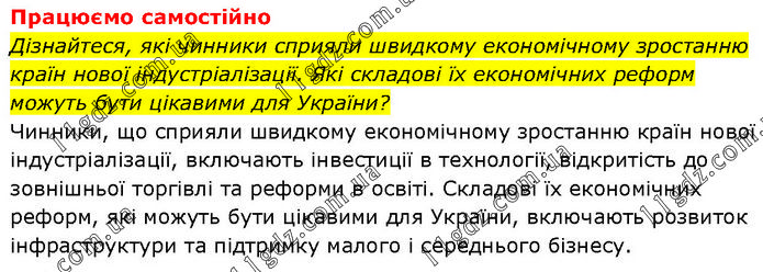 Працюємо самостійно Дізнайтеся, які чинники сприяли швидкому економічному зростанню країн нової індустріалізації. Які складові їх економічних реформ можуть бути цікавими для України? Чинники, що сприяли швидкому економічному зростанню країн нової індустріалізації, включають інвестиції в технології, відкритість до зовнішньої торгівлі та реформи в освіті. Складові їх економічних реформ, які можуть бути цікавими для України, включають розвиток інфраструктури та підтримку малого і середнього бізнесу.