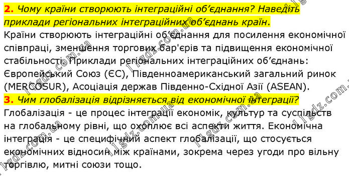 2. Чому країни створюють інтеграційні об’єднання? Наведіть приклади регіональних інтеграційних об’єднань країн. Країни створюють інтеграційні об’єднання для посилення економічної співпраці, зменшення торгових бар'єрів та підвищення економічної стабільності. Приклади регіональних інтеграційних об’єднань: Європейський Союз (ЄС), Південноамериканський загальний ринок (МERCOSUR), Асоціація держав Південно-Східної Азії (ASEAN). 3. Чим глобалізація відрізняється від економічної інтеграції? Глобалізація - це процес інтеграції економік, культур та суспільств на глобальному рівні, що охоплює всі аспекти життя. Економічна інтеграція - це специфічний аспект глобалізації, що стосується економічних відносин між країнами, зокрема через угоди про вільну торгівлю, митні союзи тощо.