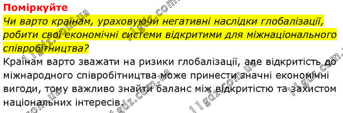 Поміркуйте Чи варто країнам, ураховуючи негативні наслідки глобалізації, робити свої економічні системи відкритими для міжнаціонального співробітництва? Країнам варто зважати на ризики глобалізації, але відкритість до міжнародного співробітництва може принести значні економічні вигоди, тому важливо знайти баланс між відкритістю та захистом національних інтересів.
