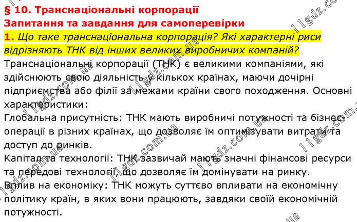 § 10. Транснаціональні корпорації Запитання та завдання для самоперевірки 1. Що таке транснаціональна корпорація? Які характерні риси відрізняють ТНК від інших великих виробничих компаній? Транснаціональні корпорації (ТНК) є великими компаніями, які здійснюють свою діяльність у кількох країнах, маючи дочірні підприємства або філії за межами країни свого походження. Основні характеристики: Глобальна присутність: ТНК мають виробничі потужності та бізнес-операції в різних країнах, що дозволяє їм оптимізувати витрати та доступ до ринків. Капітал та технології: ТНК зазвичай мають значні фінансові ресурси та передові технології, що дозволяє їм домінувати на ринку. Вплив на економіку: ТНК можуть суттєво впливати на економічну політику країн, в яких вони працюють, завдяки своїй економічній потужності.