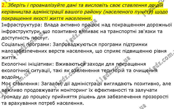 2. Зберіть і проаналізуйте дані та висловіть своє ставлення до дій керівництва адміністрації вашого району (населеного пункту) щодо покращення якості життя населення. Інфраструктура: Влада активно працює над покращенням дорожньої інфраструктури, що позитивно впливає на транспортні зв'язки та доступність послуг. Соціальні програми: Запроваджуються програми підтримки малозабезпечених верств населення, що сприяє підвищенню рівня життя. Екологічні ініціативи: Вживаються заходи для покращення екологічної ситуації, такі як озеленення територій та очищення водойм. Моє ставлення: Загалом, дії адміністрації виглядають позитивно, але важливо продовжувати моніторинг їх ефективності та залучати громаду до процесу прийняття рішень для забезпечення прозорості та врахування потреб населення.