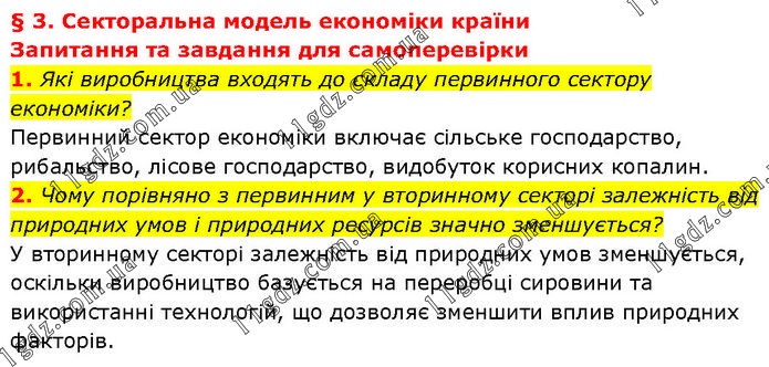 § 3. Секторальна модель економіки країни Запитання та завдання для самоперевірки 1. Які виробництва входять до складу первинного сектору економіки? Первинний сектор економіки включає сільське господарство, рибальство, лісове господарство, видобуток корисних копалин. 2. Чому порівняно з первинним у вторинному секторі залежність від природних умов і природних ресурсів значно зменшується? У вторинному секторі залежність від природних умов зменшується, оскільки виробництво базується на переробці сировини та використанні технологій, що дозволяє зменшити вплив природних факторів.