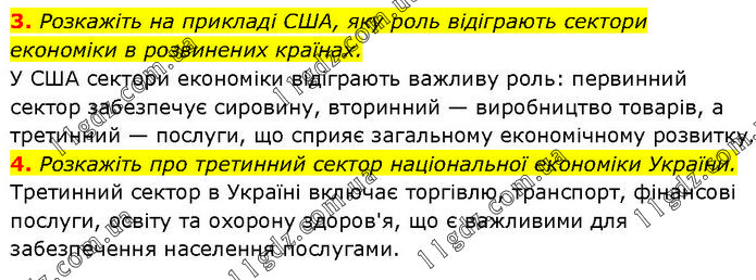 3. Розкажіть на прикладі США, яку роль відіграють сектори економіки в розвинених країнах. У США сектори економіки відіграють важливу роль: первинний сектор забезпечує сировину, вторинний — виробництво товарів, а третинний — послуги, що сприяє загальному економічному розвитку. 4. Розкажіть про третинний сектор національної економіки України. Третинний сектор в Україні включає торгівлю, транспорт, фінансові послуги, освіту та охорону здоров'я, що є важливими для забезпечення населення послугами.