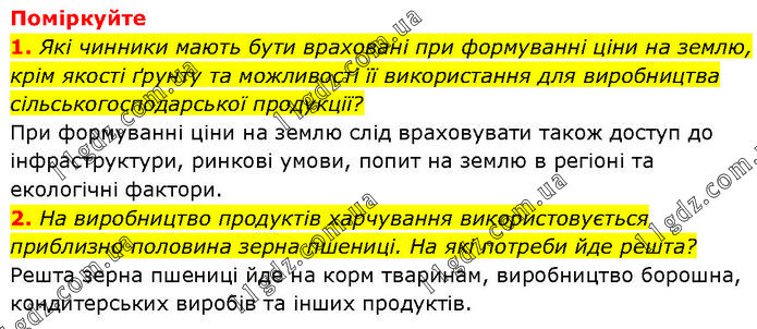 Поміркуйте 1. Які чинники мають бути враховані при формуванні ціни на землю, крім якості ґрунту та можливості її використання для виробництва сільськогосподарської продукції? При формуванні ціни на землю слід враховувати також доступ до інфраструктури, ринкові умови, попит на землю в регіоні та екологічні фактори. 2. На виробництво продуктів харчування використовується приблизно половина зерна пшениці. На які потреби йде решта? Решта зерна пшениці йде на корм тваринам, виробництво борошна, кондитерських виробів та інших продуктів.