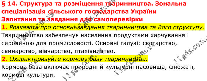 § 14. Структура та розміщення тваринництва. Зональна спеціалізація сільського господарства України Запитання та завдання для самоперевірки 1. Розкажіть про основні завдання тваринництва та його структуру. Тваринництво забезпечує населення продуктами харчування і сировиною для промисловості. Основні галузі: скотарство, свинарство, вівчарство, птахівництво. 2. Охарактеризуйте кормову базу тваринництва. Кормова база включає природні й культурні пасовища, сіножаті, кормові культури.