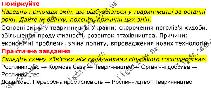 Поміркуйте Наведіть приклади змін, що відбуваються у тваринництві за останні роки. Дайте їм оцінку, поясніть причини цих змін. Основні зміни у тваринництві України: скорочення поголів'я худоби, збільшення продуктивності, розвиток птахівництва. Причини: економічні проблеми, зміна попиту, впровадження нових технологій. Практичне завдання Складіть схему «Зв’язки між складниками сільського господарства». Рослинництво → Кормова база → Тваринництво → Органічні добрива → Рослинництво Додатково: Переробна промисловість ↔ Рослинництво і Тваринництво.