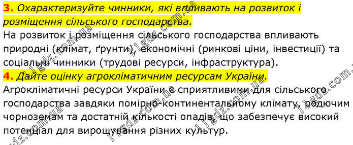3. Охарактеризуйте чинники, які впливають на розвиток і розміщення сільського господарства. На розвиток і розміщення сільського господарства впливають природні (клімат, ґрунти), економічні (ринкові ціни, інвестиції) та соціальні чинники (трудові ресурси, інфраструктура). 4. Дайте оцінку агрокліматичним ресурсам України. Агрокліматичні ресурси України є сприятливими для сільського господарства завдяки помірно-континентальному клімату, родючим чорноземам та достатній кількості опадів, що забезпечує високий потенціал для вирощування різних культур.