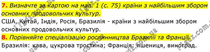 7. Визначте за картою на мал. 1 (с. 75) країни з найбільшим збором основних продовольчих культур. США, Китай, Індія, Росія, Бразилія - країни з найбільшим збором основних продовольчих культур. 8. Порівняйте спеціалізацію рослинництва Бразилії та Франції. Бразилія: кава, цукрова тростина; Франція: пшениця, виноград.