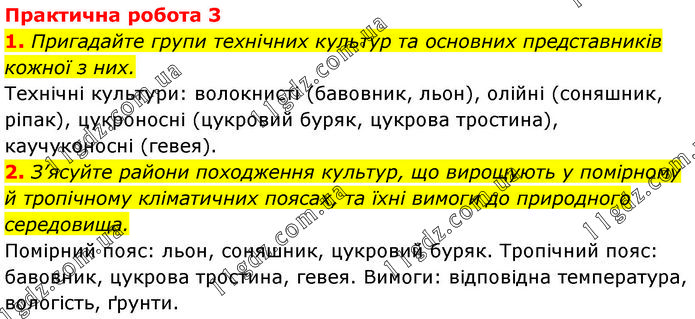 Практична робота 3 1. Пригадайте групи технічних культур та основних представників кожної з них. Технічні культури: волокнисті (бавовник, льон), олійні (соняшник, ріпак), цукроносні (цукровий буряк, цукрова тростина), каучуконосні (гевея). 2. З’ясуйте райони походження культур, що вирощують у помірному й тропічному кліматичних поясах, та їхні вимоги до природного середовища. Помірний пояс: льон, соняшник, цукровий буряк. Тропічний пояс: бавовник, цукрова тростина, гевея. Вимоги: відповідна температура, вологість, ґрунти.