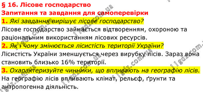 § 16. Лісове господарство Запитання та завдання для самоперевірки 1. Які завдання вирішує лісове господарство? Лісове господарство займається відтворенням, охороною та раціональним використанням лісових ресурсів. 2. Як і чому змінюється лісистість території України? Лісистість України зменшується через вирубку лісів. Зараз вона становить близько 16% території. 3. Охарактеризуйте чинники, що впливають на географію лісів. На географію лісів впливають клімат, рельєф, ґрунти та антропогенна діяльність.