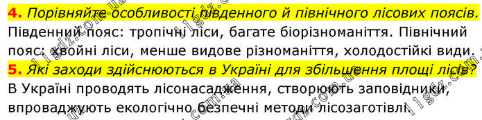 4. Порівняйте особливості південного й північного лісових поясів. Південний пояс: тропічні ліси, багате біорізноманіття. Північний пояс: хвойні ліси, менше видове різноманіття, холодостійкі види. 5. Які заходи здійснюються в Україні для збільшення площі лісів? В Україні проводять лісонасадження, створюють заповідники, впроваджують екологічно безпечні методи лісозаготівлі.