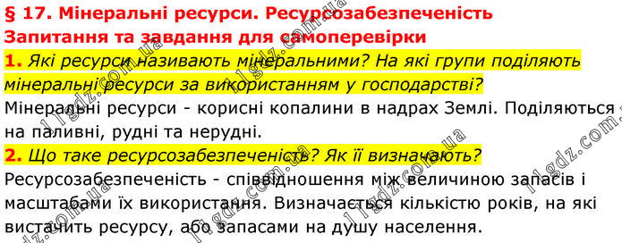 § 17. Мінеральні ресурси. Ресурсозабезпеченість Запитання та завдання для самоперевірки 1. Які ресурси називають мінеральними? На які групи поділяють мінеральні ресурси за використанням у господарстві? Мінеральні ресурси - корисні копалини в надрах Землі. Поділяються на паливні, рудні та нерудні. 2. Що таке ресурсозабезпеченість? Як її визначають? Ресурсозабезпеченість - співвідношення між величиною запасів і масштабами їх використання. Визначається кількістю років, на які вистачить ресурсу, або запасами на душу населення.