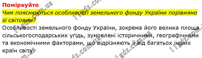 Поміркуйте Чим пояснюються особливості земельного фонду України порівняно зі світовим? Особливості земельного фонду України, зокрема його велика площа сільськогосподарських угідь, зумовлені історичними, географічними та економічними факторами, що відрізняють її від багатьох інших країн світу.