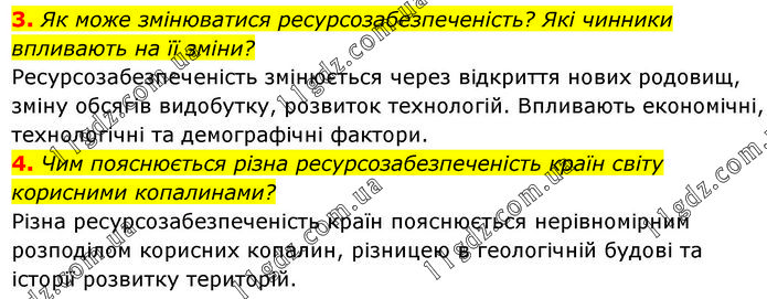 3. Як може змінюватися ресурсозабезпеченість? Які чинники впливають на її зміни? Ресурсозабезпеченість змінюється через відкриття нових родовищ, зміну обсягів видобутку, розвиток технологій. Впливають економічні, технологічні та демографічні фактори. 4. Чим пояснюється різна ресурсозабезпеченість країн світу корисними копалинами? Різна ресурсозабезпеченість країн пояснюється нерівномірним розподілом корисних копалин, різницею в геологічній будові та історії розвитку територій.