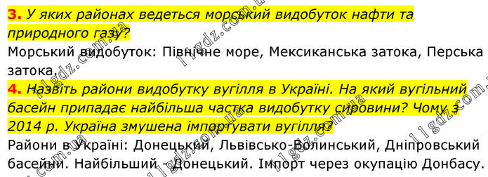 3. У яких районах ведеться морський видобуток нафти та природного газу? Морський видобуток: Північне море, Мексиканська затока, Перська затока. 4. Назвіть райони видобутку вугілля в Україні. На який вугільний басейн припадає найбільша частка видобутку сировини? Чому з 2014 р. Україна змушена імпортувати вугілля? Райони в Україні: Донецький, Львівсько-Волинський, Дніпровський басейни. Найбільший - Донецький. Імпорт через окупацію Донбасу.