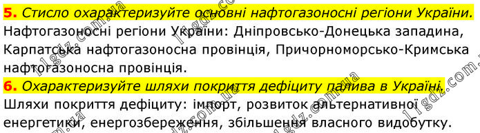 5. Стисло охарактеризуйте основні нафтогазоносні регіони України. Нафтогазоносні регіони України: Дніпровсько-Донецька западина, Карпатська нафтогазоносна провінція, Причорноморсько-Кримська нафтогазоносна провінція. 6. Охарактеризуйте шляхи покриття дефіциту палива в Україні. Шляхи покриття дефіциту: імпорт, розвиток альтернативної енергетики, енергозбереження, збільшення власного видобутку.