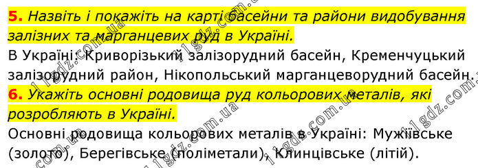 5. Назвіть і покажіть на карті басейни та райони видобування залізних та марганцевих руд в Україні. В Україні: Криворізький залізорудний басейн, Кременчуцький залізорудний район, Нікопольський марганцеворудний басейн. 6. Укажіть основні родовища руд кольорових металів, які розробляють в Україні. Основні родовища кольорових металів в Україні: Мужіївське (золото), Берегівське (поліметали), Клинцівське (літій).