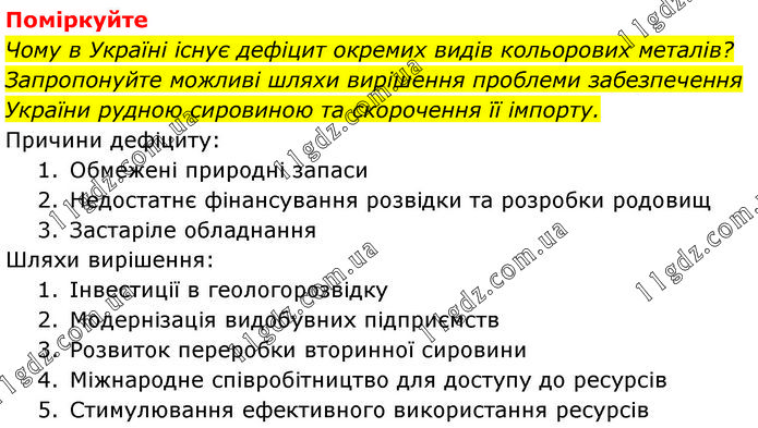 Поміркуйте Чому в Україні існує дефіцит окремих видів кольорових металів? Запропонуйте можливі шляхи вирішення проблеми забезпечення України рудною сировиною та скорочення її імпорту. Причини дефіциту: 1. Обмежені природні запаси 2. Недостатнє фінансування розвідки та розробки родовищ 3. Застаріле обладнання Шляхи вирішення: 1. Інвестиції в геологорозвідку 2. Модернізація видобувних підприємств 3. Розвиток переробки вторинної сировини 4. Міжнародне співробітництво для доступу до ресурсів 5. Стимулювання ефективного використання ресурсів